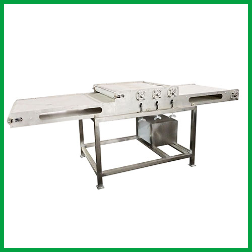 其結(jié)構(gòu)由機(jī)架、驅(qū)動(dòng)機(jī)構(gòu)、傳動(dòng)機(jī)構(gòu)、成形機(jī)構(gòu)等部分組成。魚片直接放入搟片機(jī)輸送帶上,在壓輥壓力作用下,通過(guò)定做的模板,加工出特定形狀的魚片,外形平整美觀,纖維疏松,吃起來(lái)口感綿柔,不粘牙齒。
